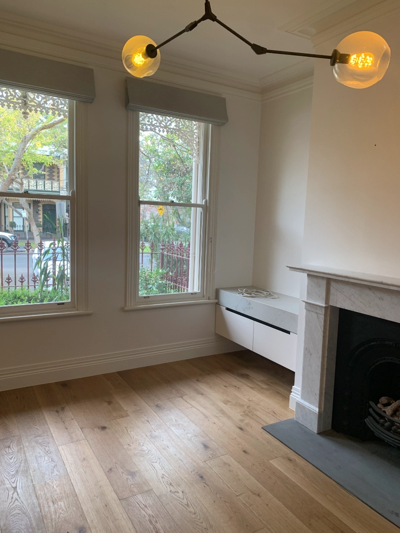 A remodel of a heritage terrace home, blending preserved period features with modern updates, including updated flooring, built-in storage solutions, restored fireplace elements, and contemporary lighting for an elegant living area.