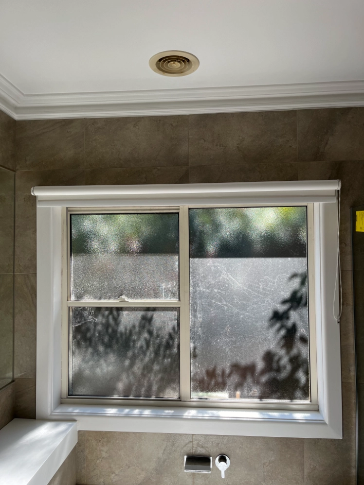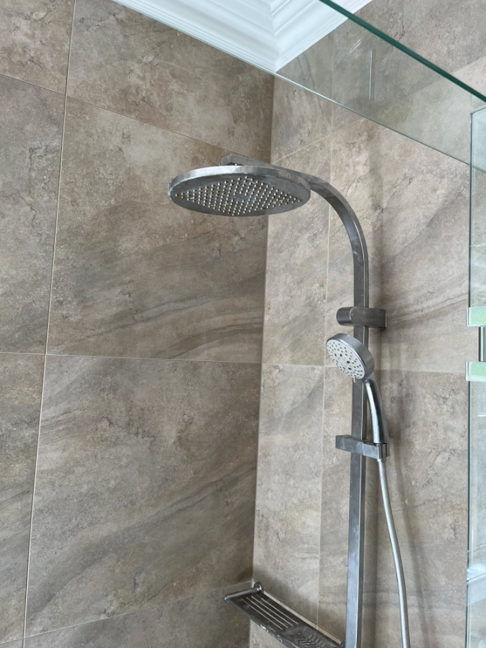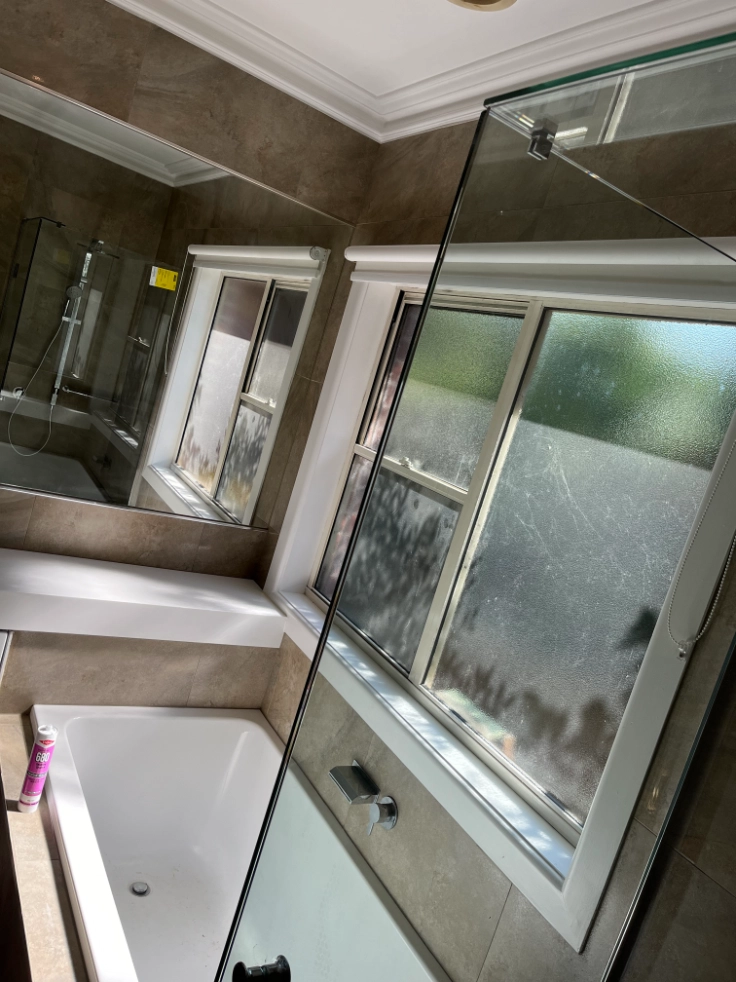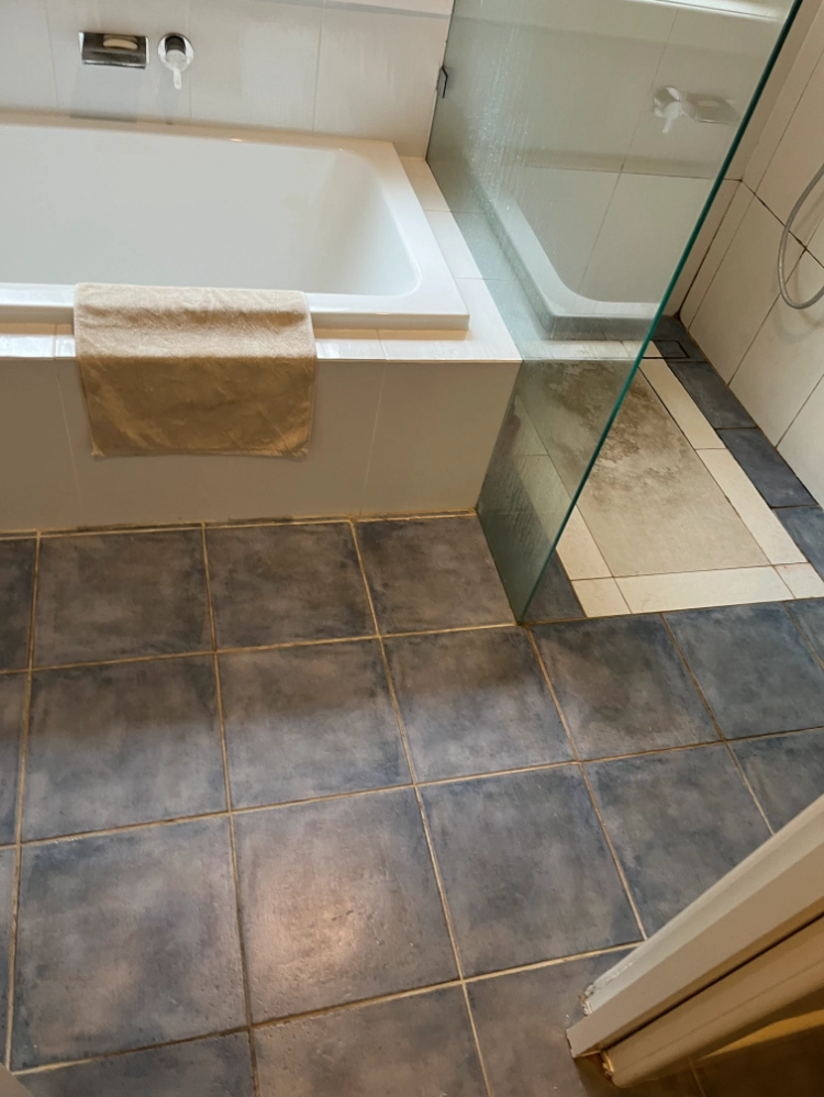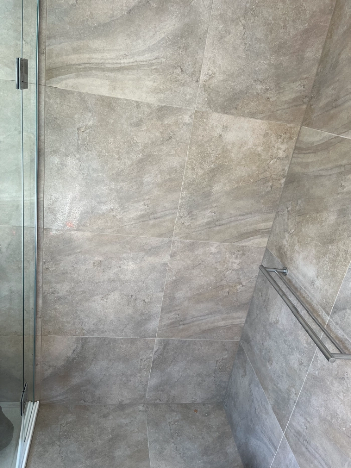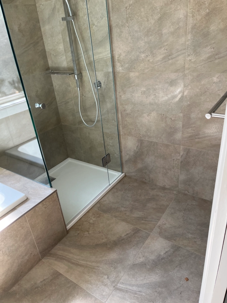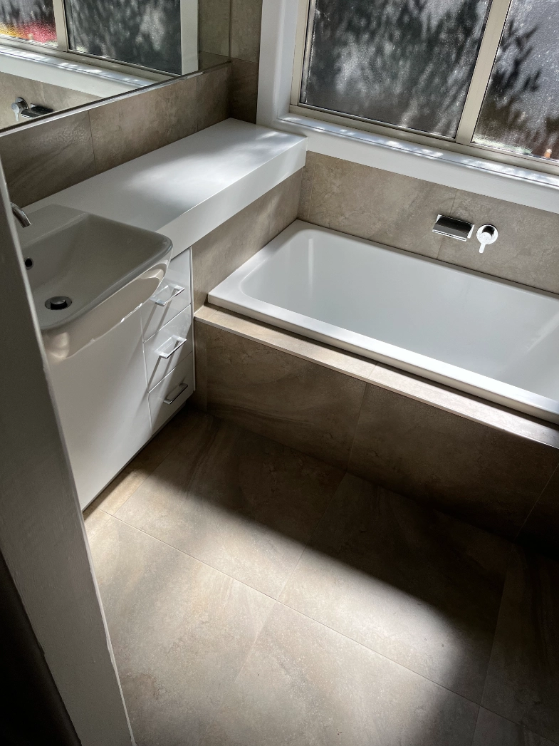 A transformation from an outdated design to a modern bathroom, featuring large-format tiles, a freestanding bathtub, glass-enclosed shower, storage vanity, and updated fixtures for a serene and functional space.